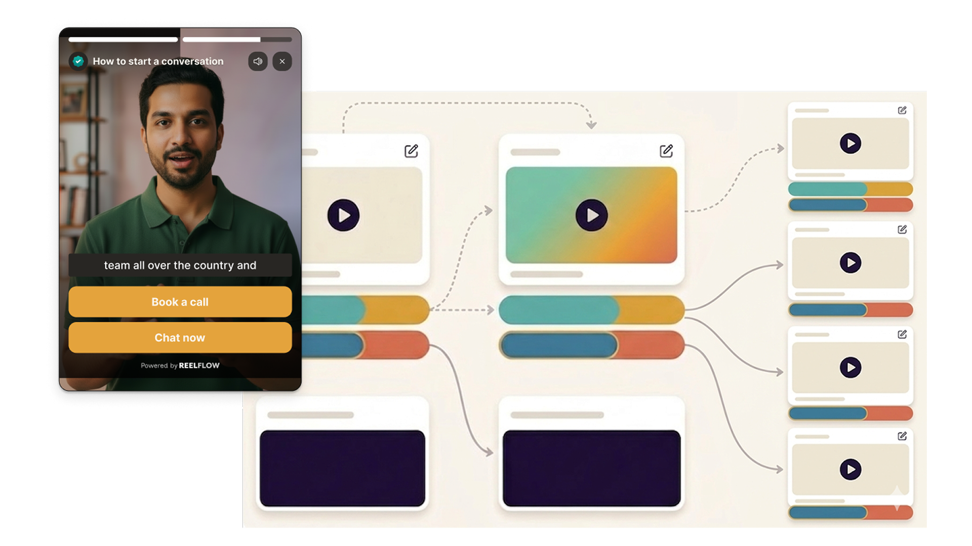 You don't need a film crew to build trust. Record and upload your videos, and add to your interactive flows in minutes. Need help? Explore our video marketplace or upgrade to our AI Video Stand-In feature.